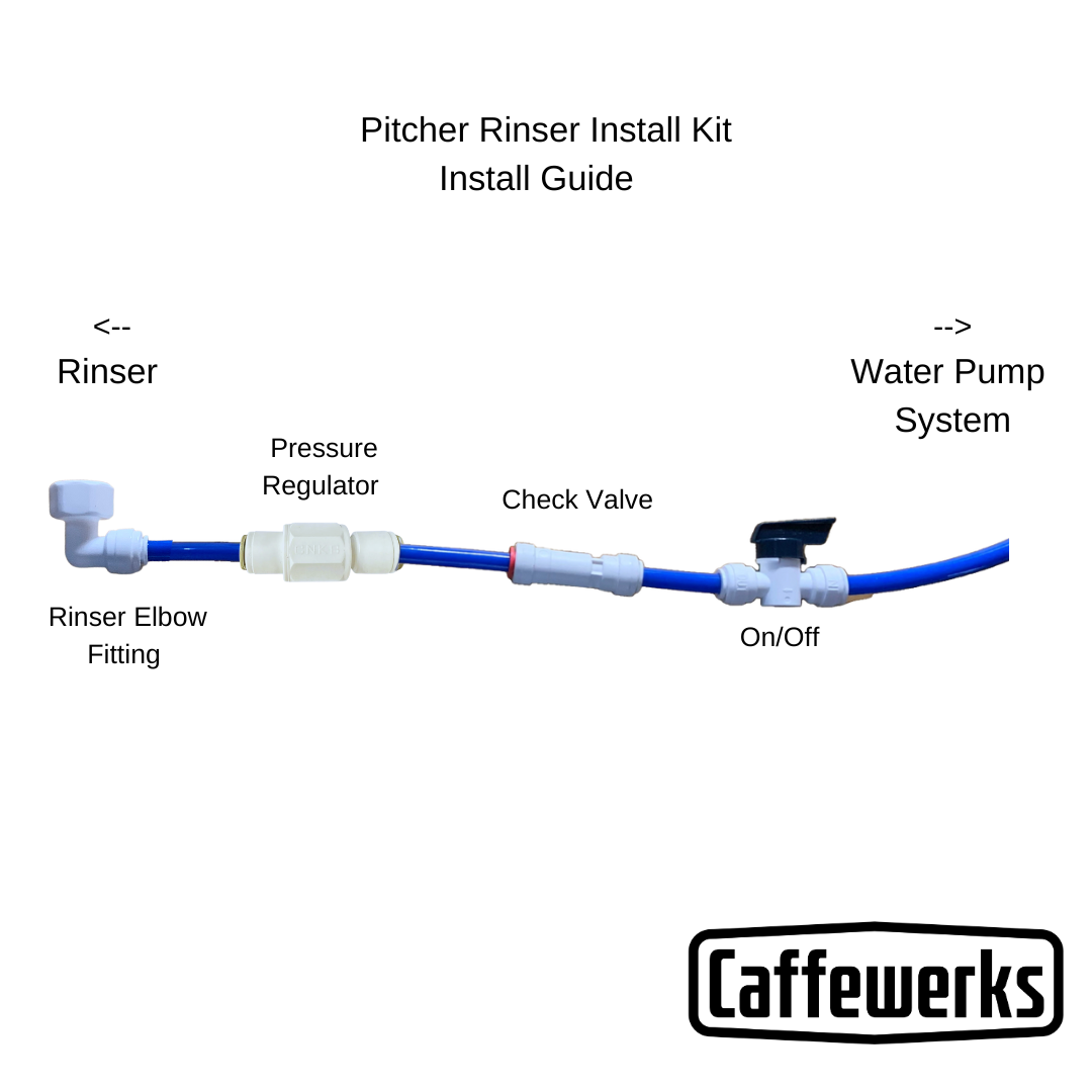 The Rinser Connect Kit includes 5 ft of NSF approved Surethane flexible tubing with quick connects, and is plumbed with an on/off valve, checked valve, and a 90 degree 1/2" BSP Rinser fitting for space saving.
