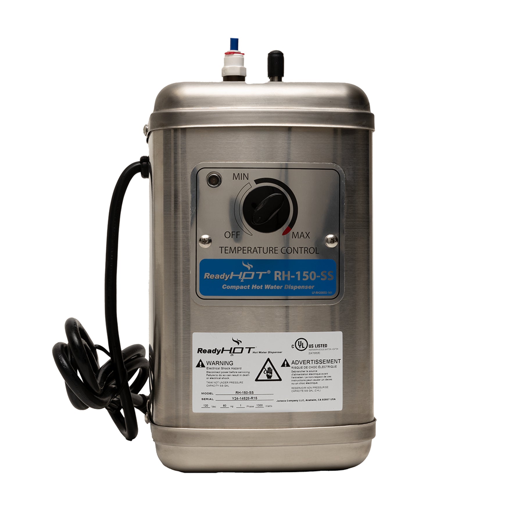 The ReadyHot RH-150-SS is a compact, adjustable hot water dispenser that operates on standard 110v power. With a temperature range from ambient to over 195°F, it's well-suited for preparing tea, Americanos, or even for hand washing. The unit measures 10.7" high, 6.3" wide, and 6.7" deep, with a 2.5-quart tank capable of dispensing up to 60 cups of hot water per hour.