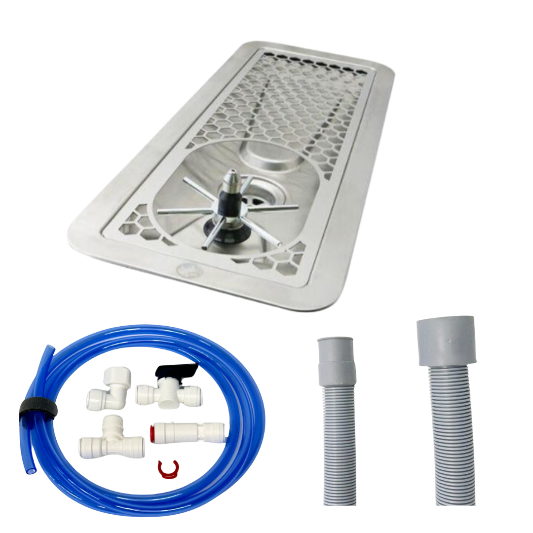 - Do not cut out bench top surfaces prior to receiving your rinser: Due to slight variations in manufacturing design and the varying requirements of bench materials, it is strongly recommended to have the physical vessel rinser on-hand prior to cutting into bench top surfaces. Bombora Supplies does not take responsibility for errors concerning installation and provides the sizes and dimensions as a layout guide only.